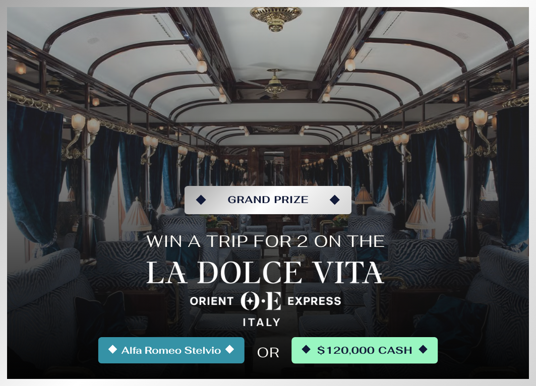 Choose your ultimate prize: $120,000 cash, a luxury Alfa Romeo Stelvio, or an extraordinary Italian holiday.
